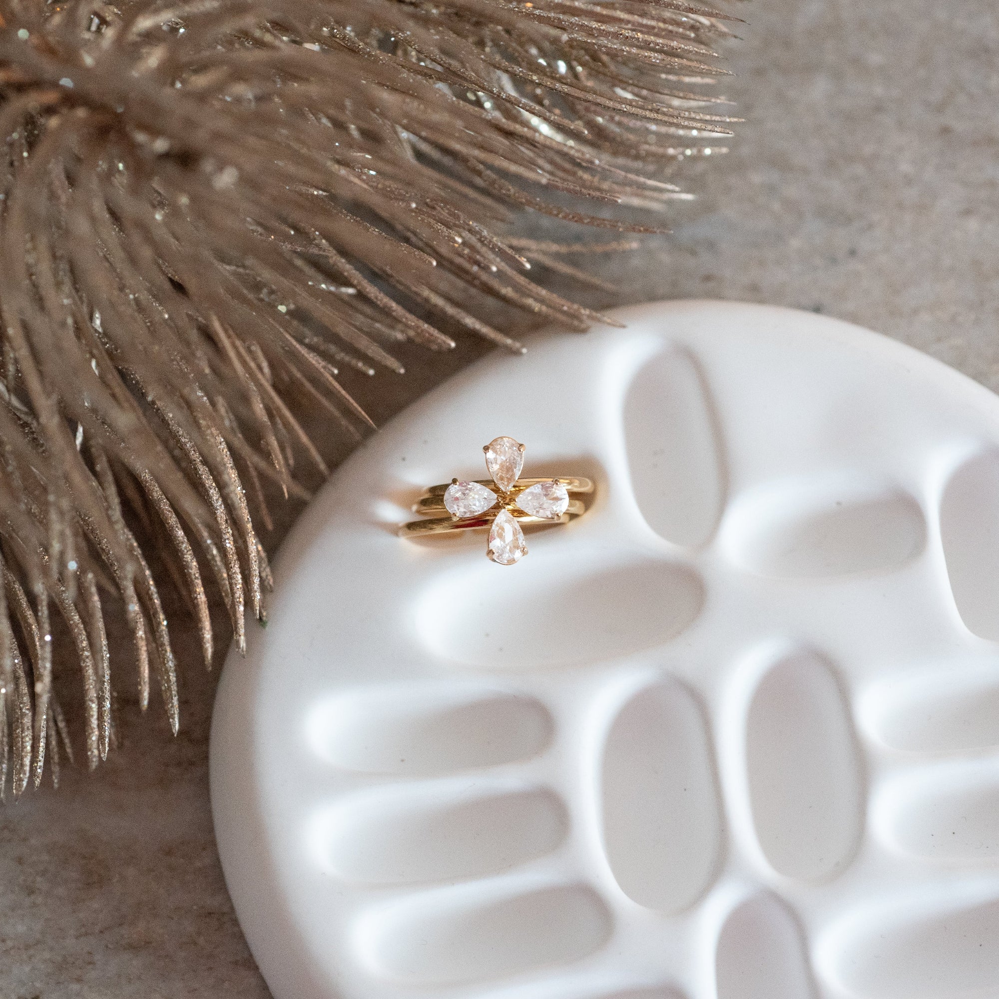 La bague Trio est une pièce lumineuse et raffinée, dessinée pour celles qui aiment une brillance assumée tout en conservant une élégance délicate.