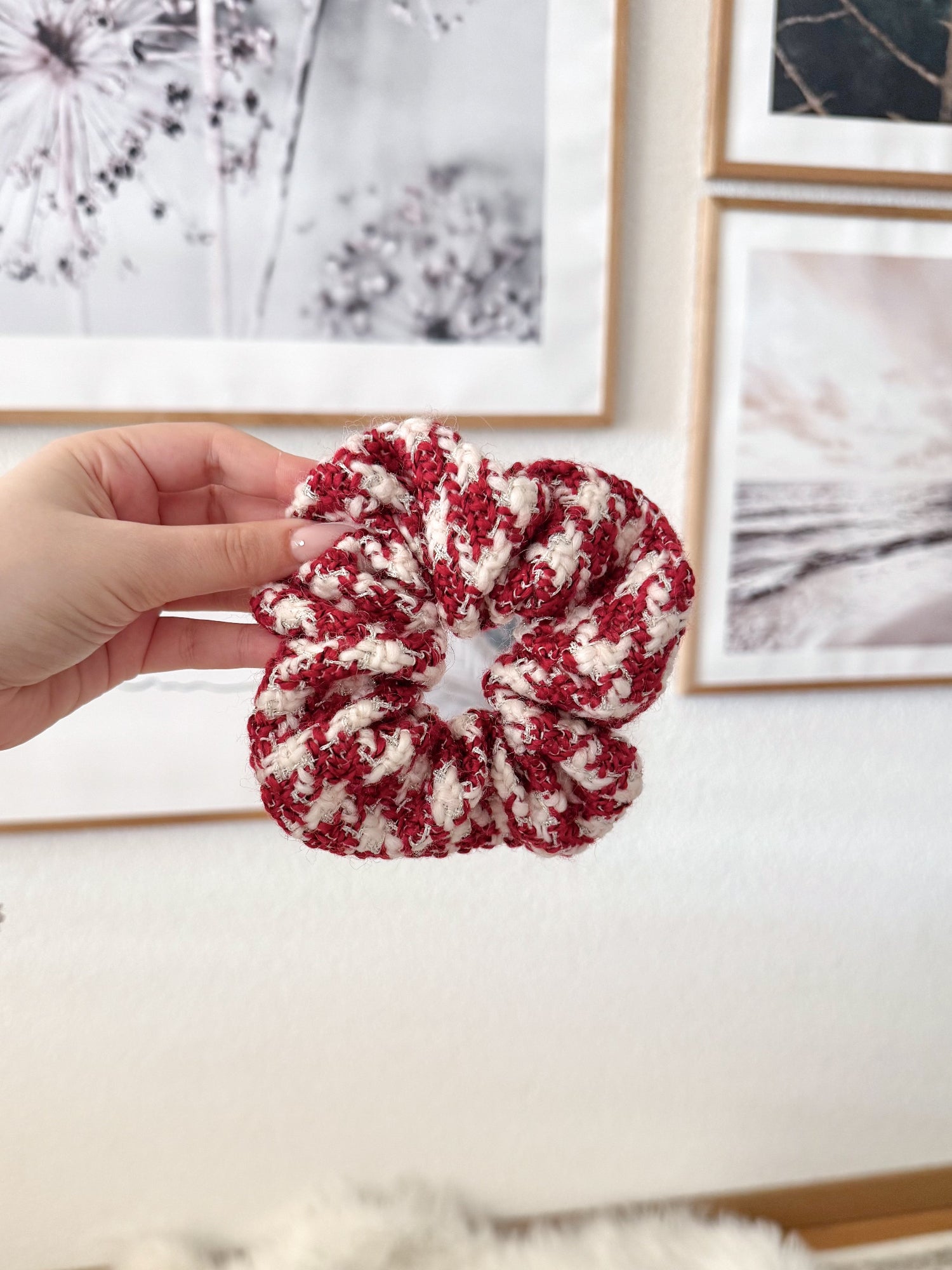 Craque pour ce chouchou au look tricoté, parfaitement dans l’esprit des fêtes. Avec son mélange de rouge éclatant et de blanc doux, il rappelle les pulls d’hiver et l’ambiance chaleureuse de Noël. Son effet fluffy et sa texture épaisse en font l’accessoire idéal pour donner du volume à tes coiffures tout en restant bien confortable.