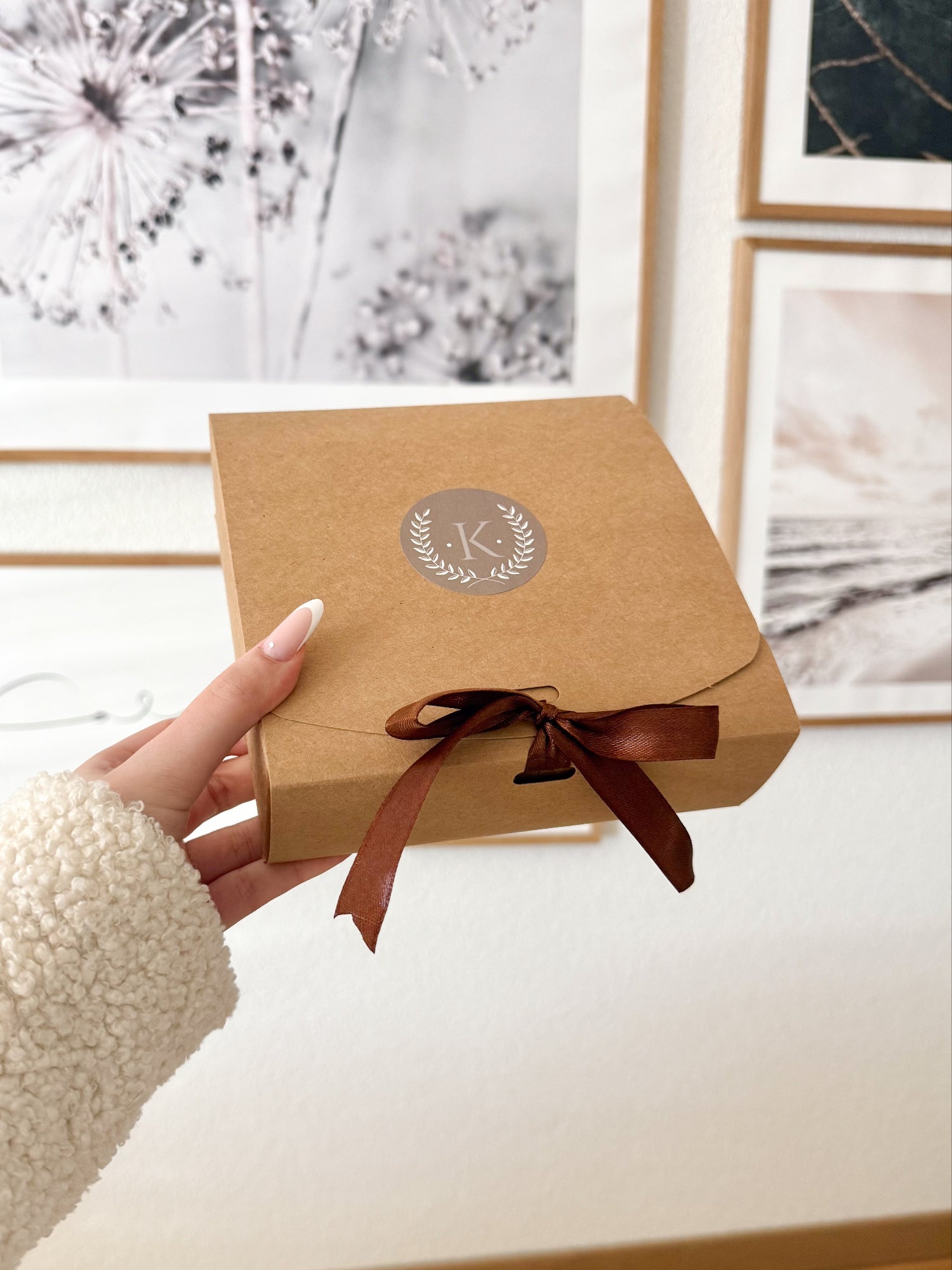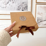 Avec un coffret rigide kraft et son ruban satin chocolat