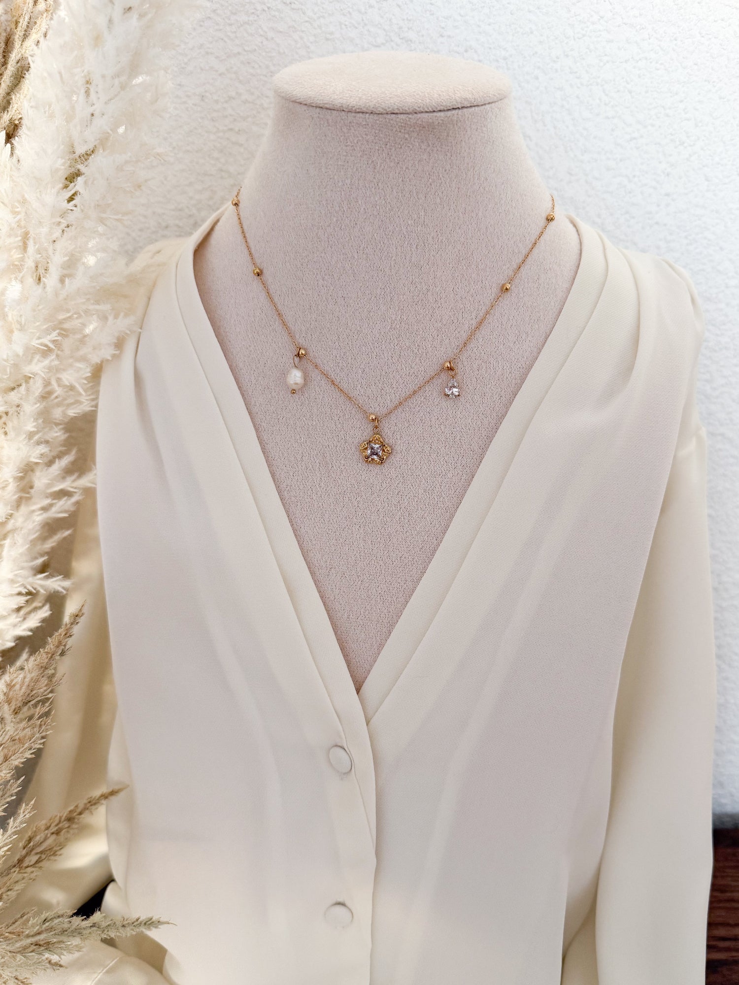 Ce collier est une pièce délicate et raffinée, pensée pour celles qui aiment les bijoux uniques et lumineux. Ce mélange harmonieux crée un collier à la fois moderne et féminin