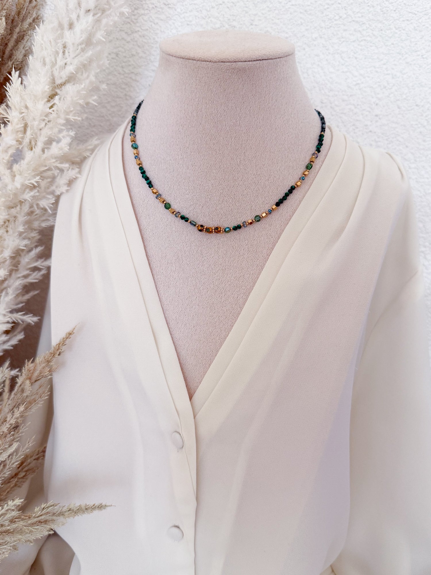 Un collier élégant et naturel qui allie la profondeur du vert émeraude à l’éclat chaleureux du doré. Facile à porter au quotidien, il se marie aussi bien avec un look simple qu'avec une tenue plus habillée. Une pièce lumineuse, délicate et intemporelle.