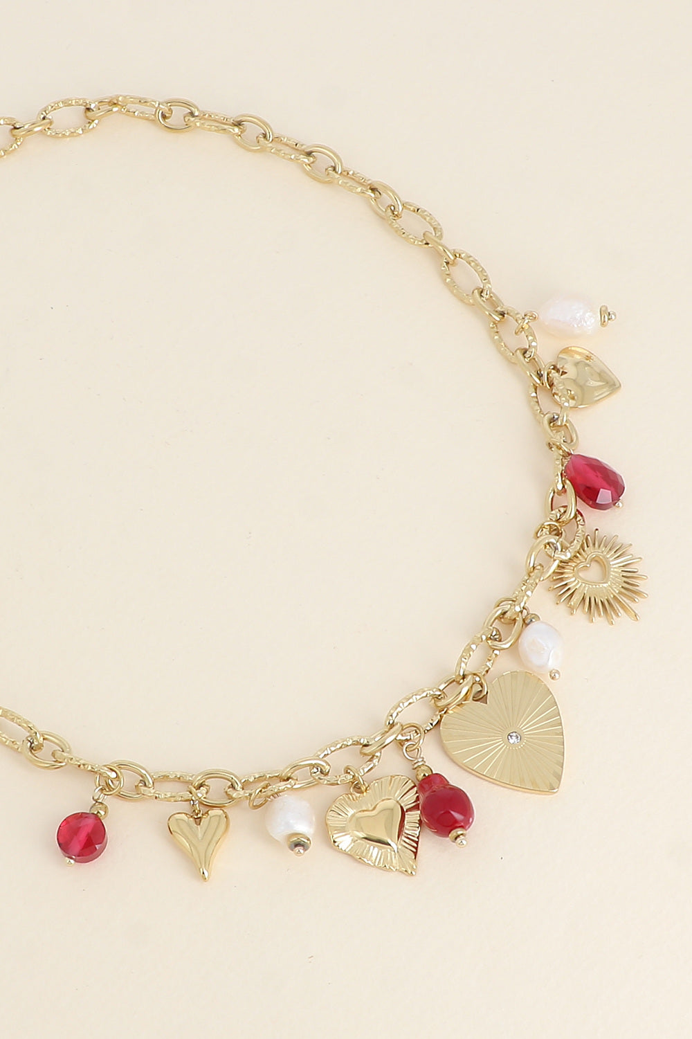• Pendentifs : cœurs, perles blanches et pierres rouges