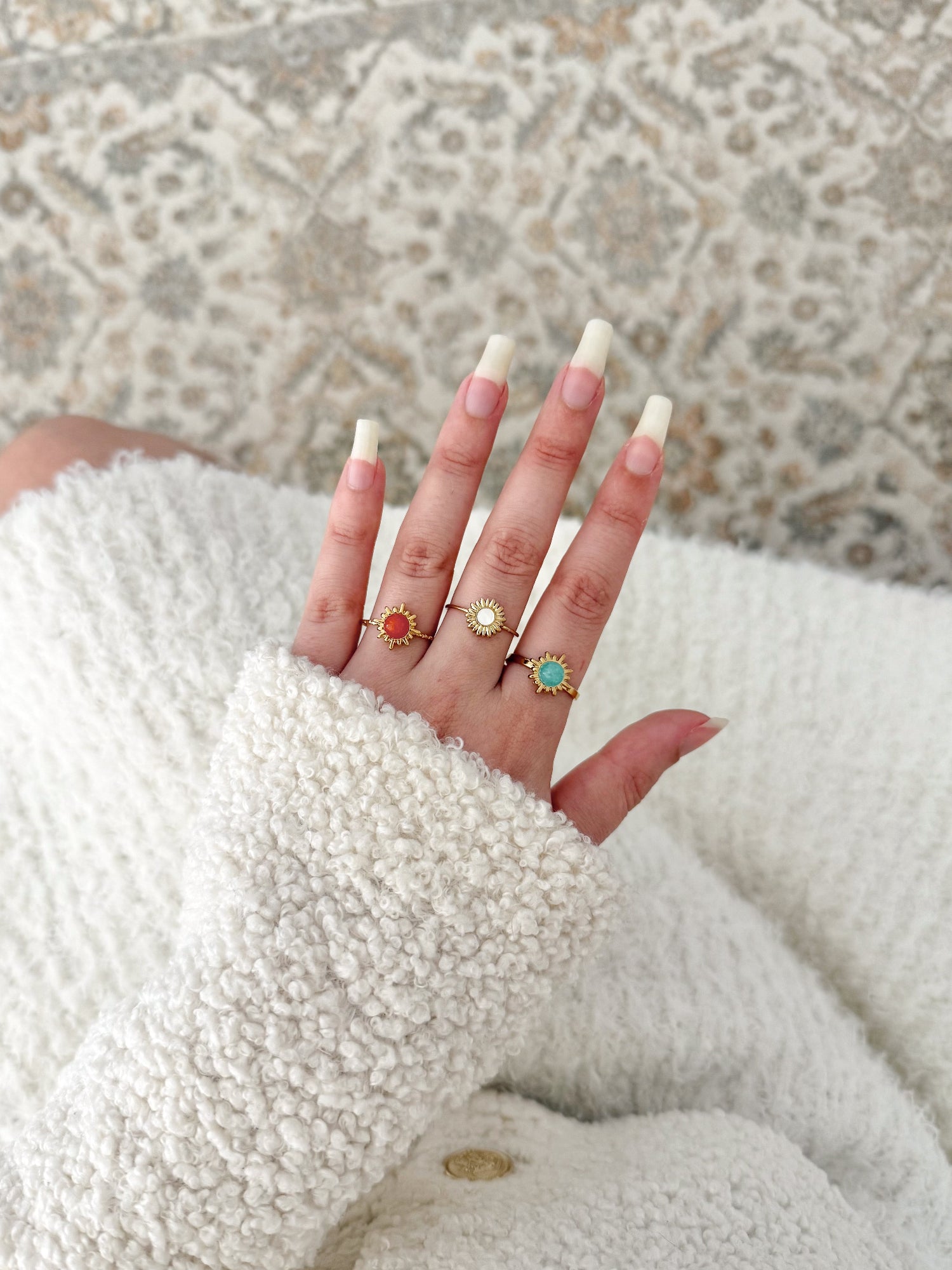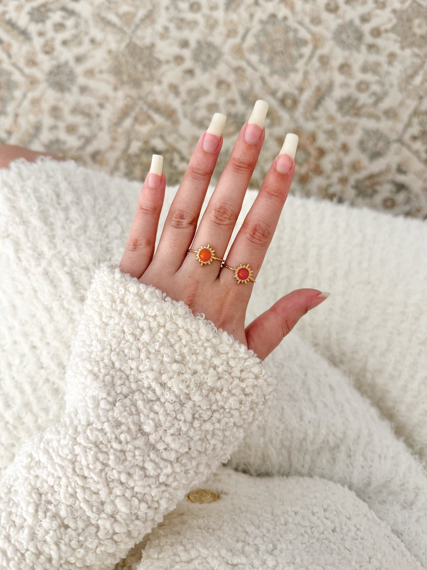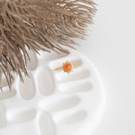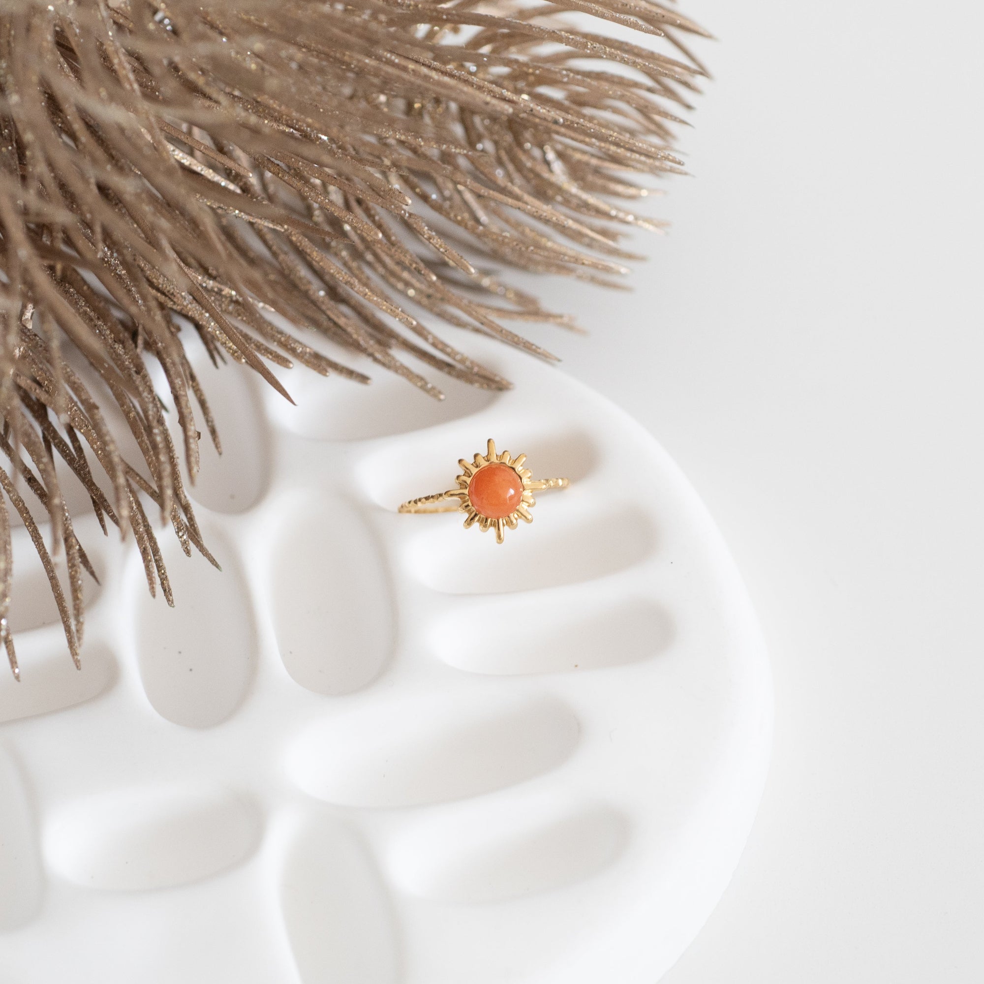 Apportez une touche de chaleur à vos mains avec cette bague couleur corail. Son design solaire illumine n’importe quel look, tandis que sa pierre centrale, d’un orange doux et vibrant, réveille l’énergie en vous.