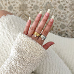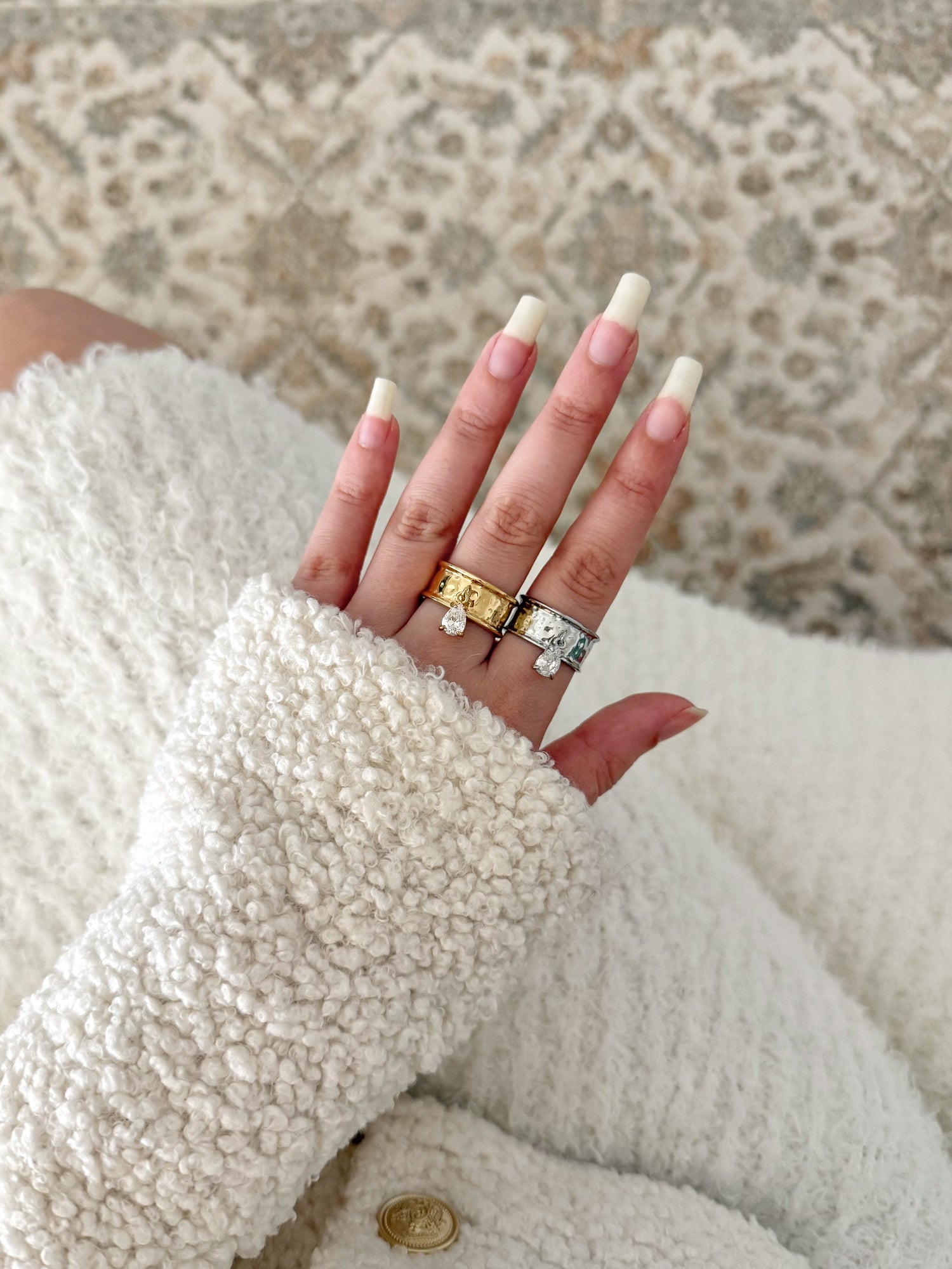 L’élégance brute rencontre la délicatesse. Cette bague se distingue par sa texture martelée et son pendentif en zircon taille goutte, qui bouge avec grâce à chaque mouvement.