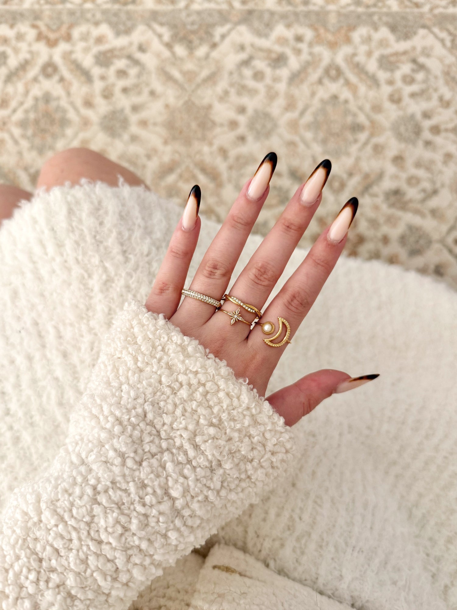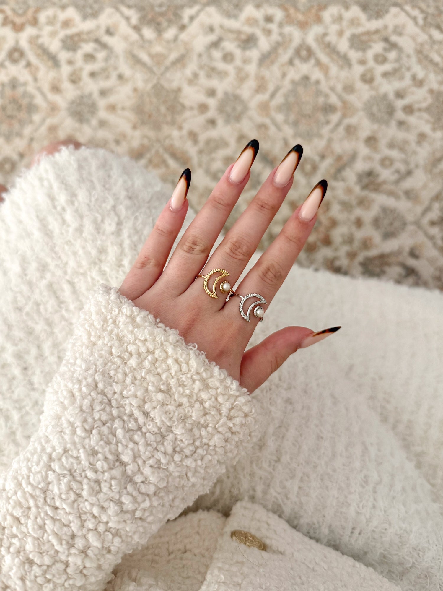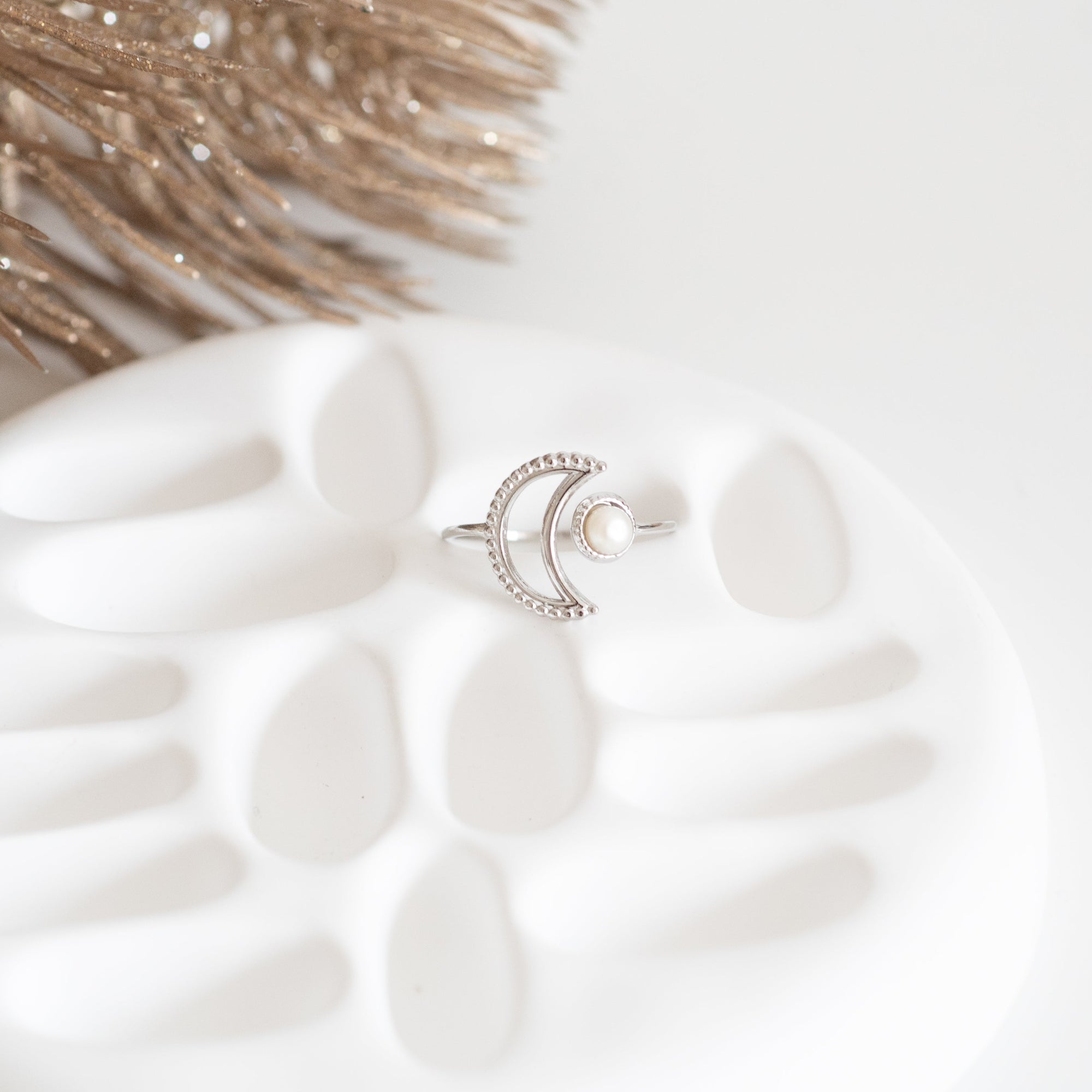 Cette bague incarne la douceur lunaire avec son croissant finement texturé et sa perle centrale au reflet nacré. Un bijou poétique qui évoque les mystères du ciel nocturne et sublime la main avec délicatesse.