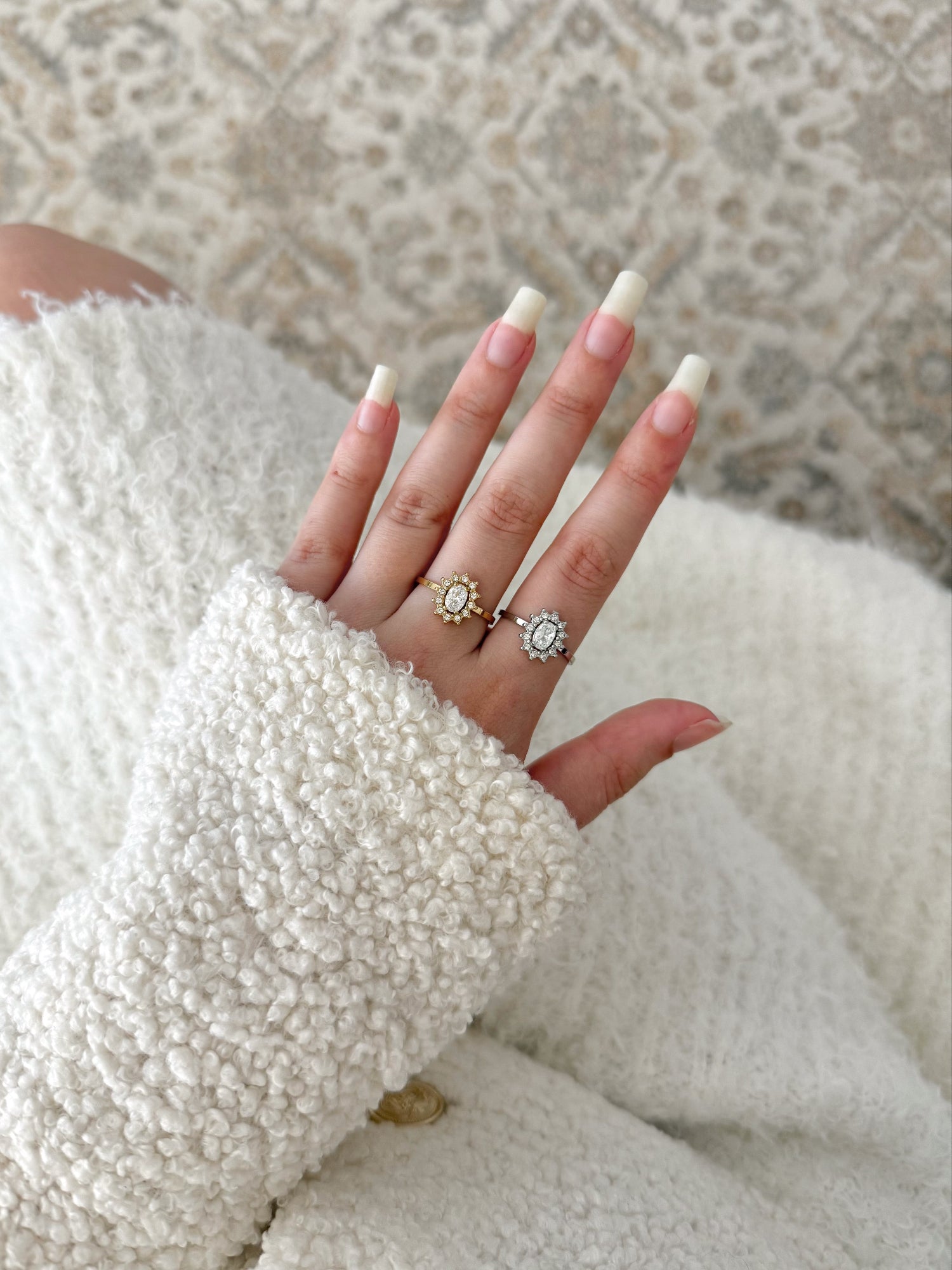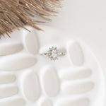 Cette bague au design délicatement rétro met en valeur une pierre ovale centrale scintillante, entourée d’un halo de strass étincelants. Une pièce qui attire tous les regards.