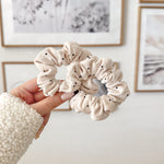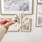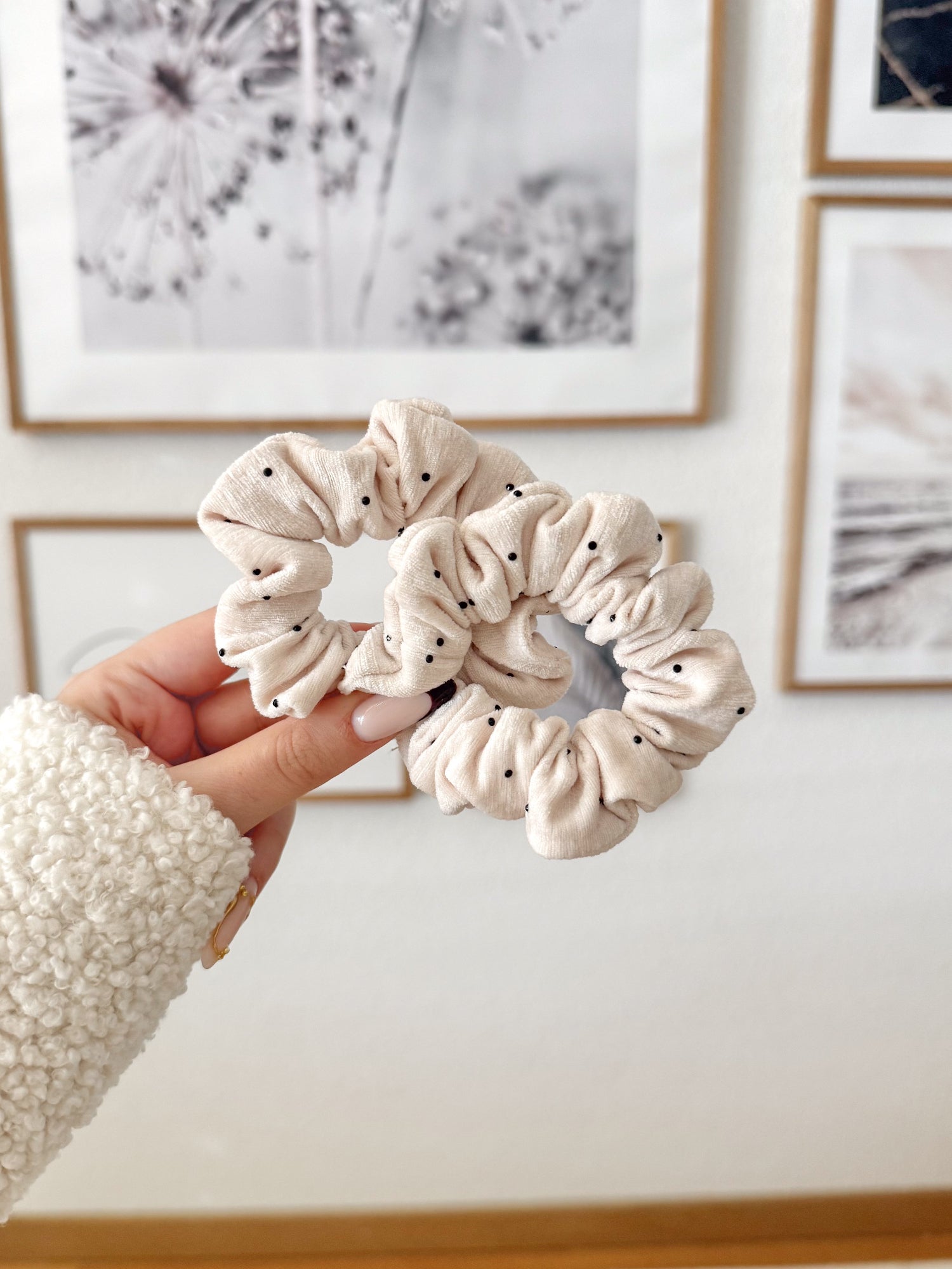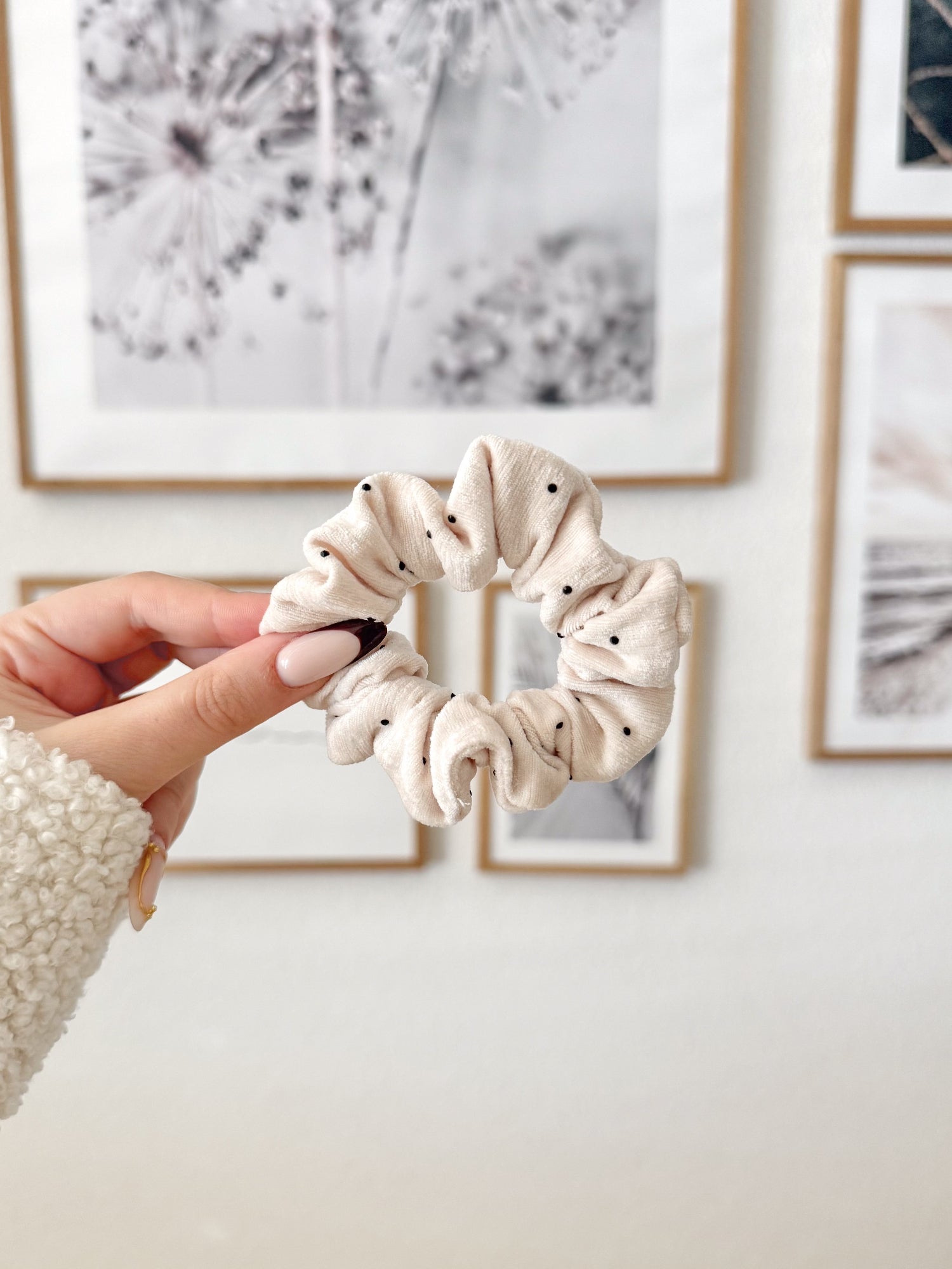 Un chouchou léger, raffiné et plein de charme avec ses petits pois noirs sur fond crème. Parfait pour ajouter une touche rétro-chic à vos coiffures du quotidien.