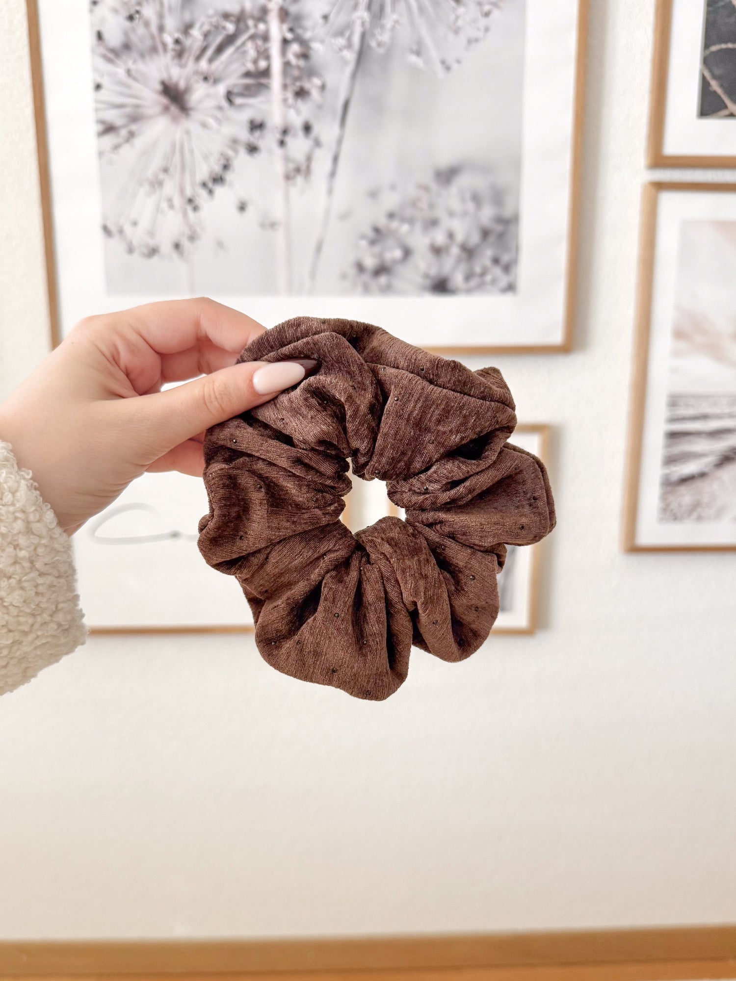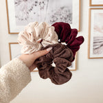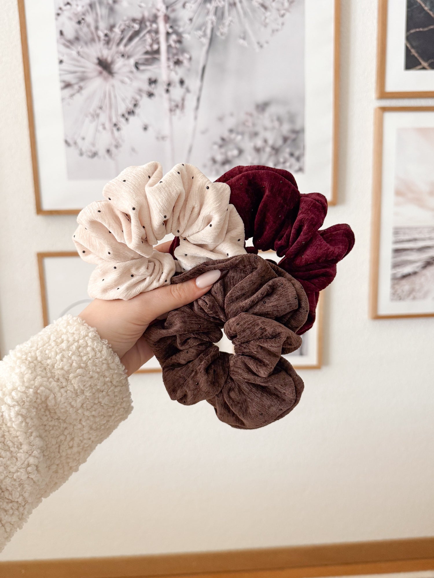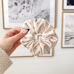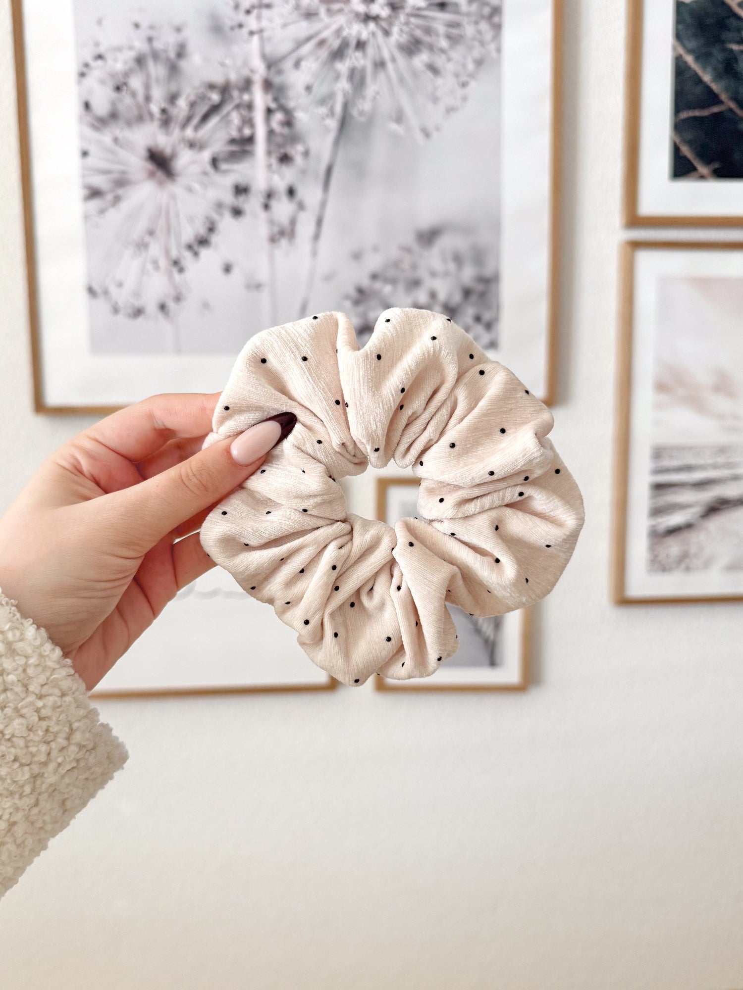 Un chouchou léger, raffiné et plein de charme avec ses petits pois noirs sur fond crème. Parfait pour ajouter une touche rétro-chic à vos coiffures du quotidien.