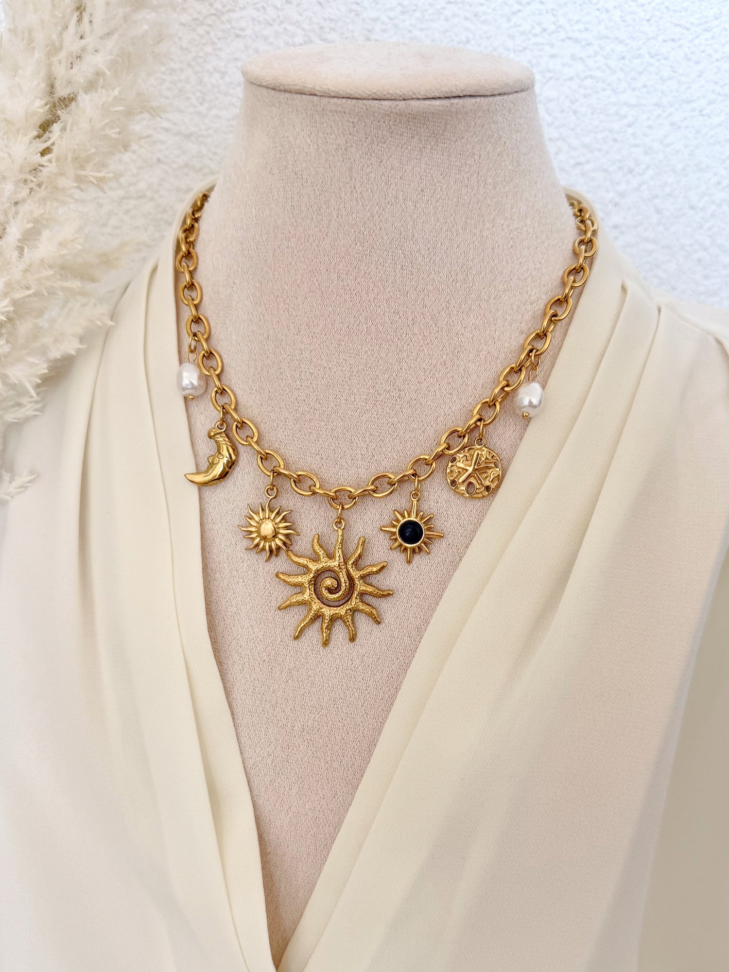 Plongez dans un univers mystique et solaire avec ce collier orné de charms célestes. Un bijou fort en symbolique, à porter au quotidien ou pour booster vos énergies.