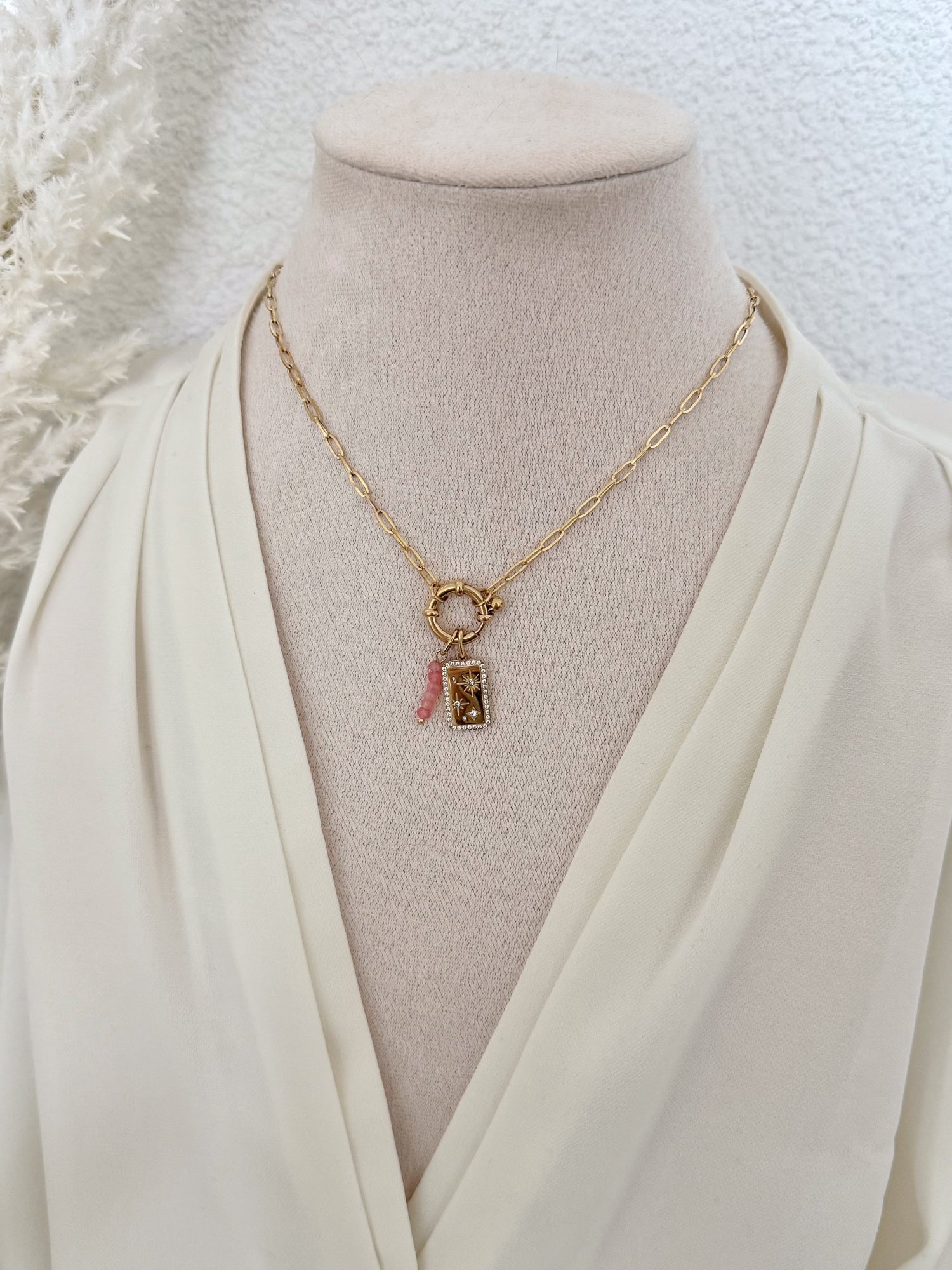 • Pendentifs inclus : Carte rectangulaire étoilée, Perles roses naturelles, Lune, Coeurs, Zircon marquise