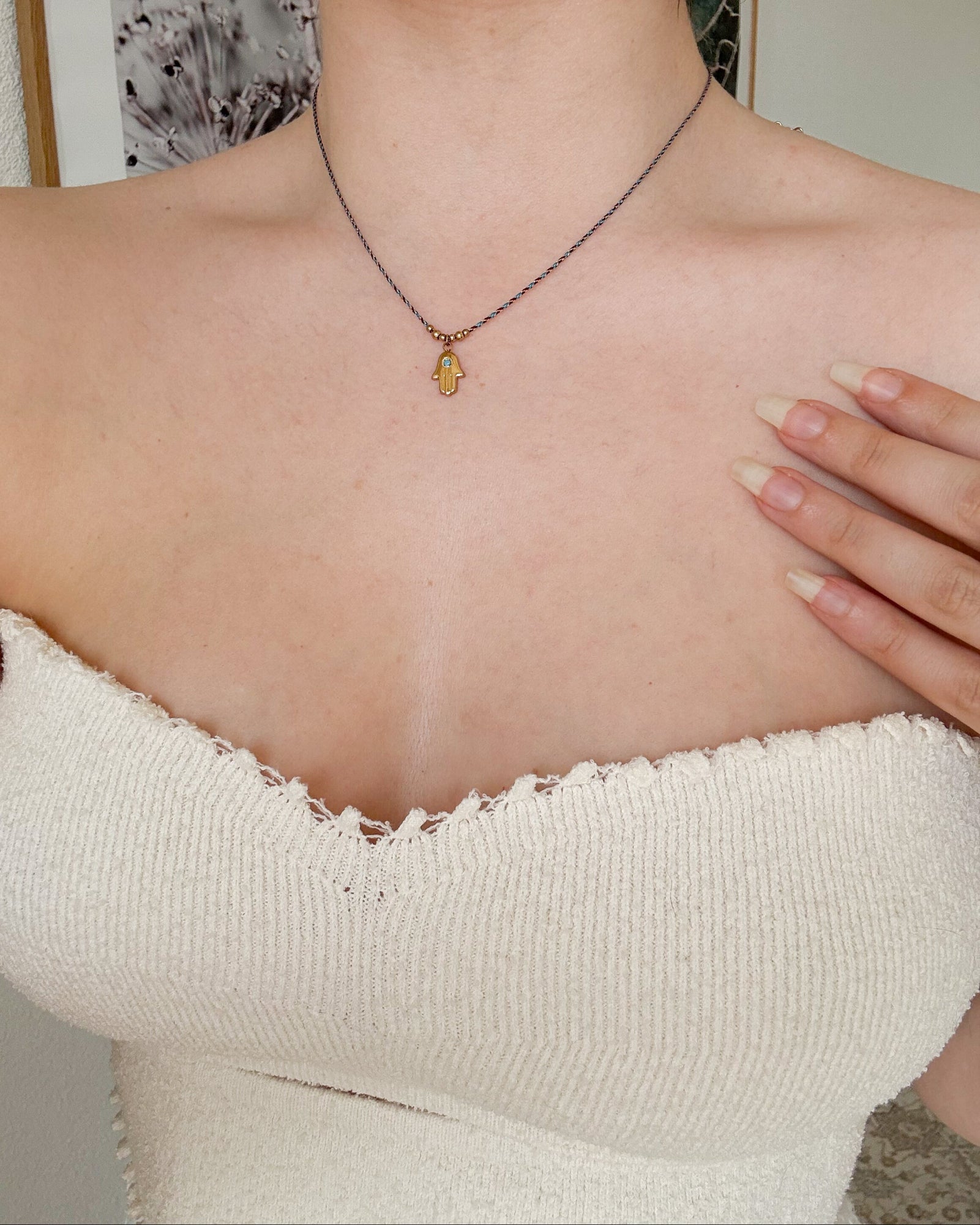 Porte-bonheur discret et symbolique, le collier Mira met en lumière une main de Fatma dorée. Elle se glisse à votre cou comme un talisman moderne et élégant.