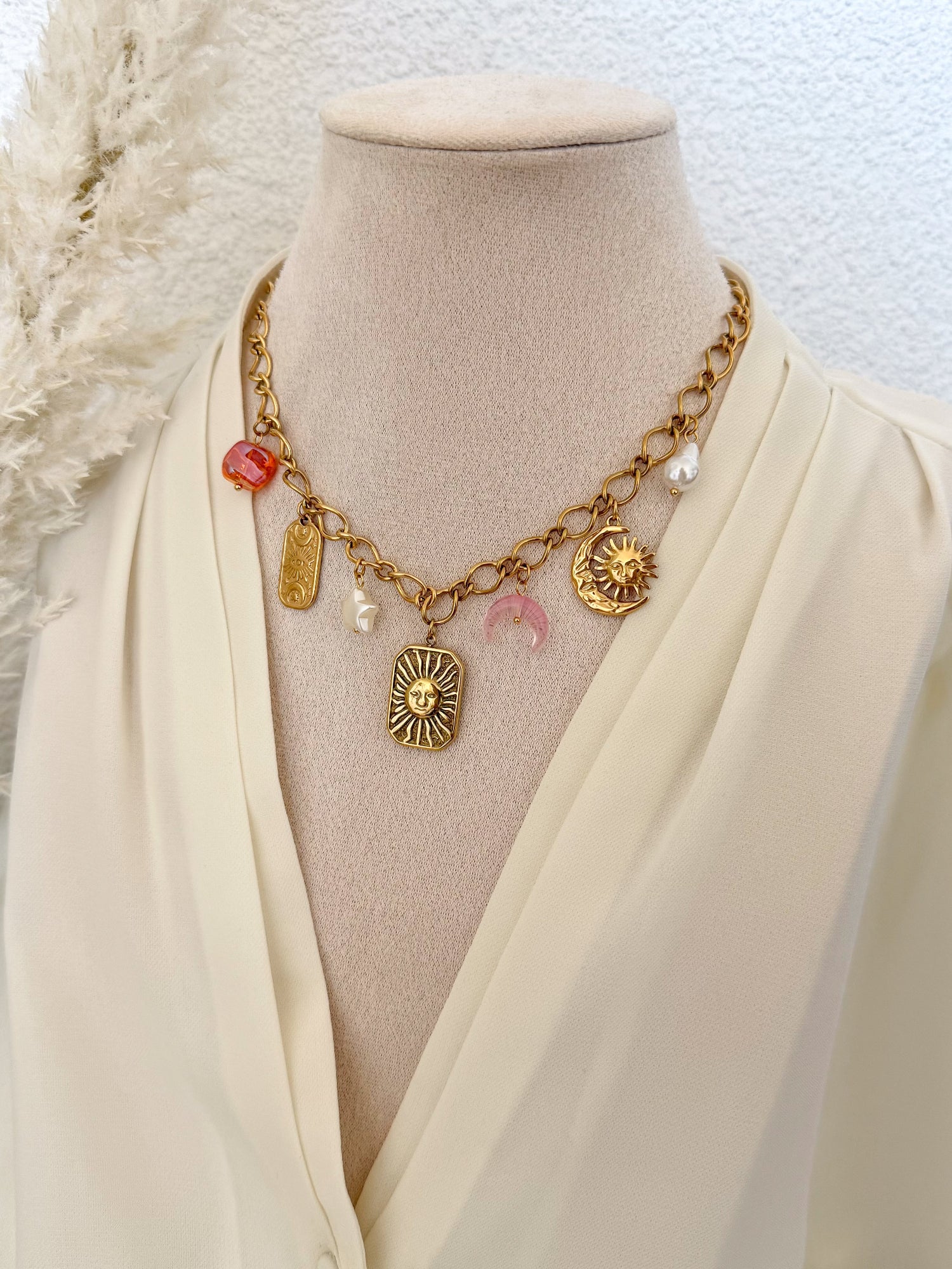 Ce collier unique rassemble les symboles célestes les plus puissants. Un bijou bohème-chic rempli de good vibes.