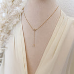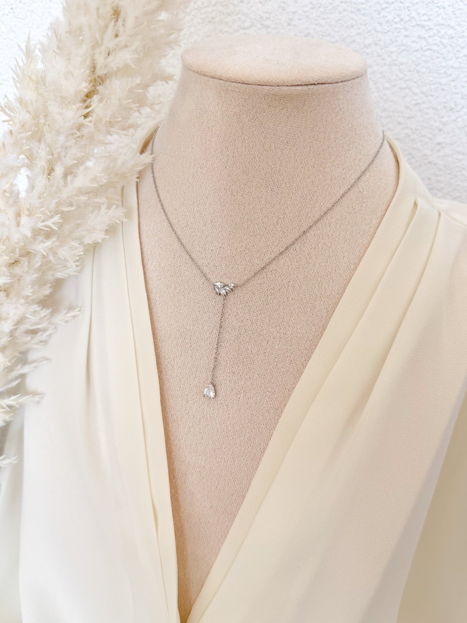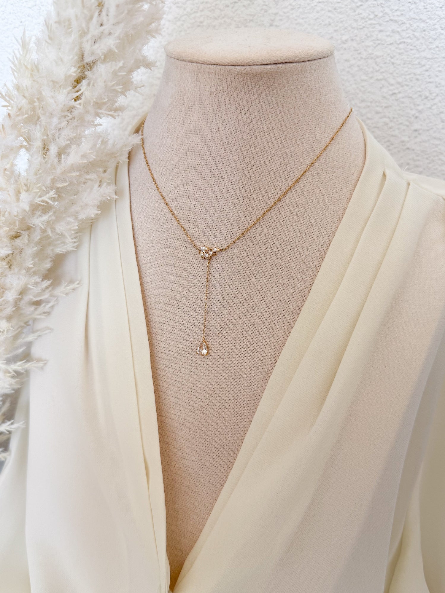 Un collier raffiné qui sublime votre décolleté. Son pendentif et sa goutte brillante créent une silhouette élégante et féminine.