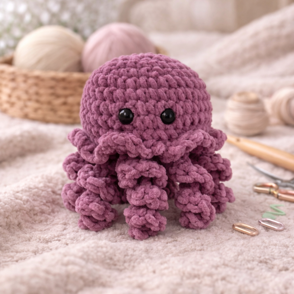 Craquez pour ce poulpe tout doux au crochet, entièrement réalisé à la main. Avec sa taille généreuse et sa texture ultra moelleuse, il est parfait comme objet décoratif, compagnon réconfortant ou cadeau plein de tendresse.