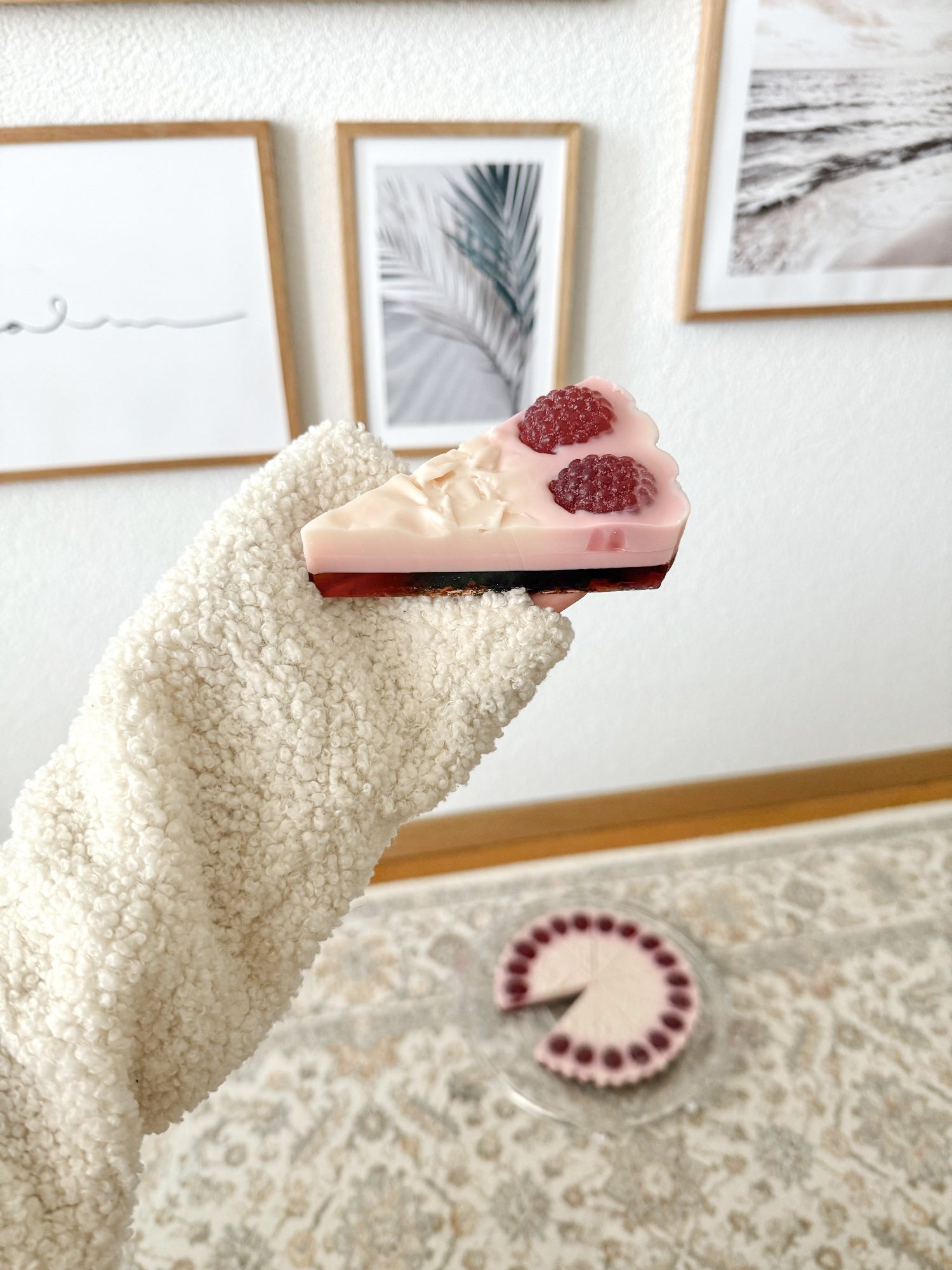 Un savon aussi beau que gourmand, qui imite à la perfection une part de tarte à la framboise. Avec sa texture "crème fouettée" et ses petites framboises brillantes sur le dessus, il est 100% fait main et surtout... 100% non comestible !