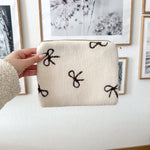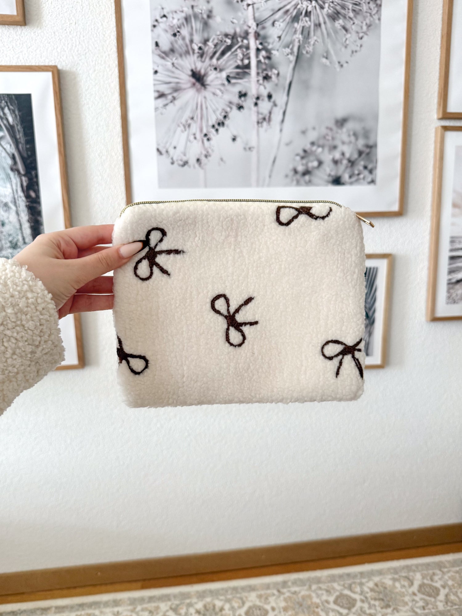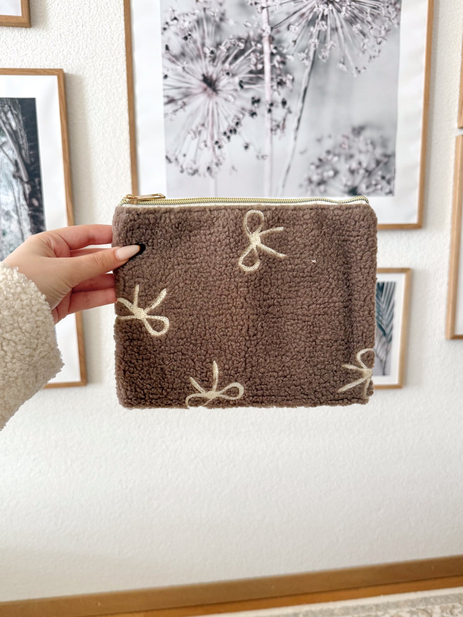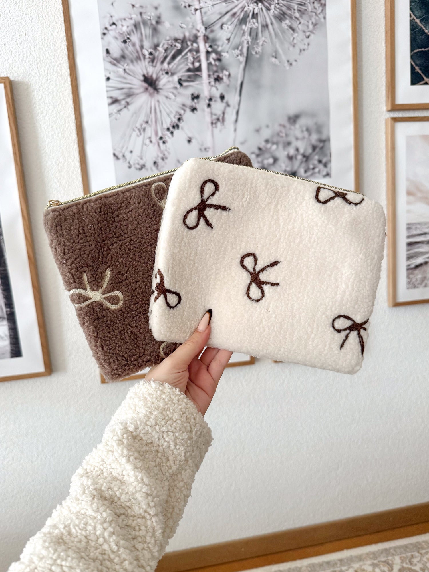 Ajoute une touche toute douce à ta routine beauté avec cette trousse en matière "teddy" ultra moelleuse. Sa texture polaire et ses petits nœuds brodés lui donnent un look à la fois cosy et stylé, parfait pour l’hiver.
